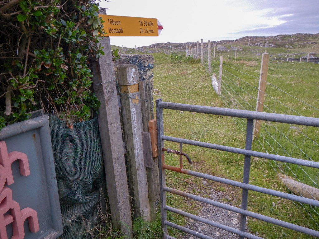 We reached the ancient settlement of Bostadh at the northern tip of the island. A storm in 1993 laid bare a section of the dunes that encroached on the coast and exposed evidence of stone buildings buried beneath the sand. Archaeologists excavated the site in 1996. Just under the surface they discovered a Norse settlement. However deeper down the Norse buildings had been erected on top of eight Iron Age houses thought to date to 500-700 BC. These houses were in a distinctive figure of eight shape, with a large circular structure linked to a smaller circular projection by an internal doorway. The large area was the main living area, while the small end was probably used for storage. Each hut was connected to its neighbours by tunnels. In many ways, the discovery at Bostadh is very similar to the famous stone village at Skara Brae on Orkney, although the latter was built several thousand years earlier. Remarkably, the hut contents had been perfectly preserved by the sand, up to the top of the walls. The huts were covered over by sand again in order to preserve them. There is a replica which was built in 1998 slightly inland from the actual village location.