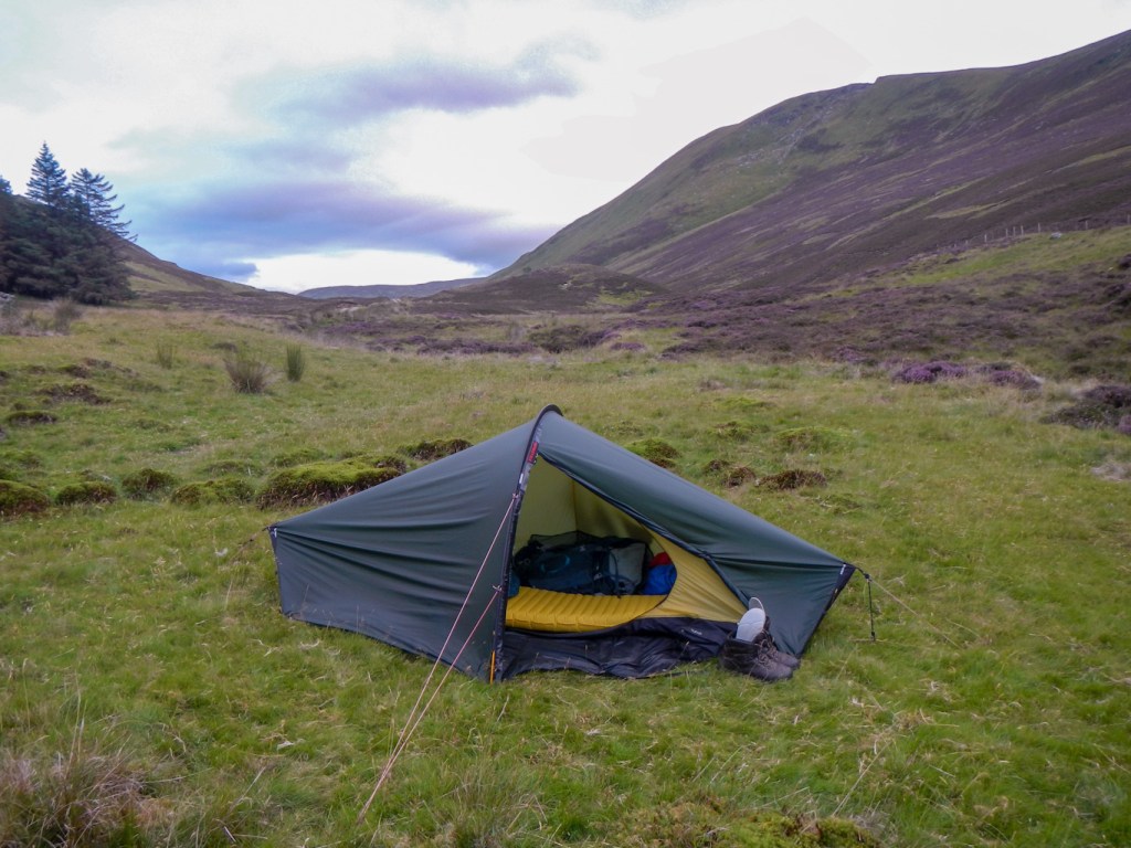 I aimed to find a spot to camp on the moor before reaching the lower pasture. The ground turned out to be hummocky and boggy but I was fortunate to find a small area with some firmer grass near the stream. The wind had dropped so there were a few midges but otherwise it was a perfect campsite and probably the best wild camp for me on the entire route.