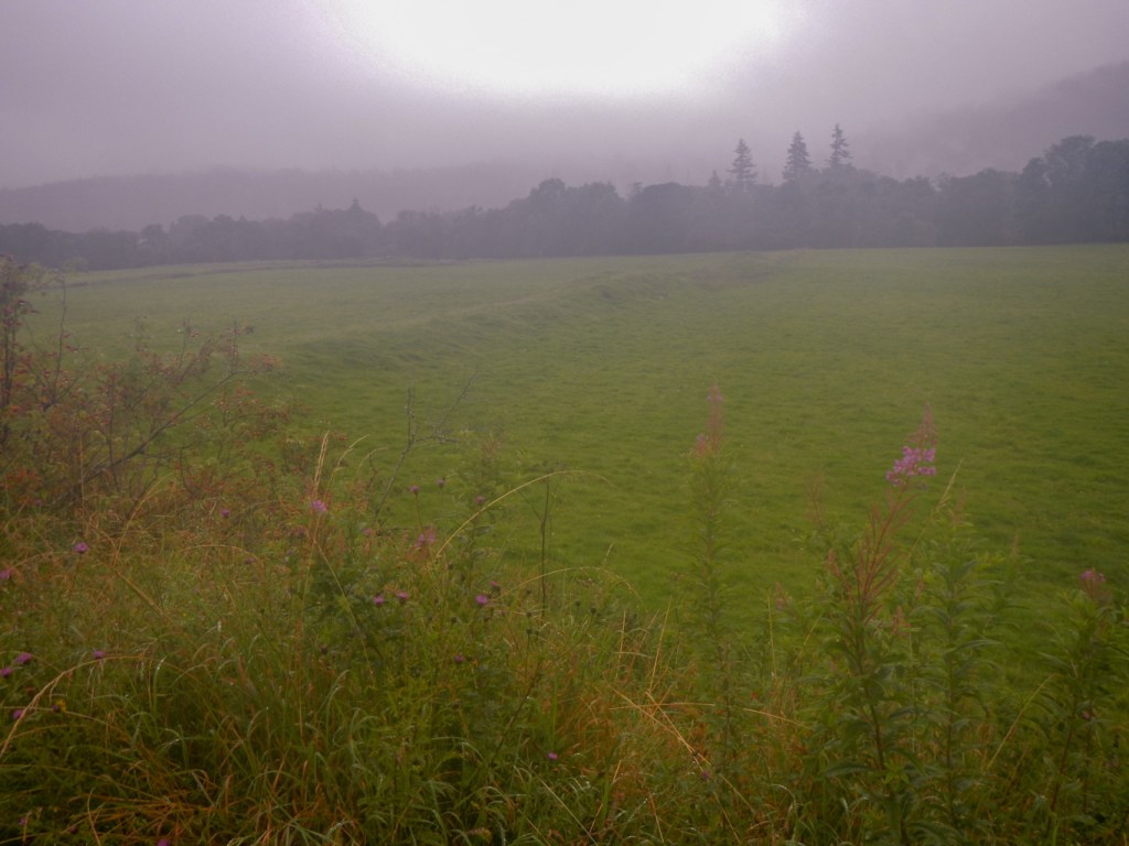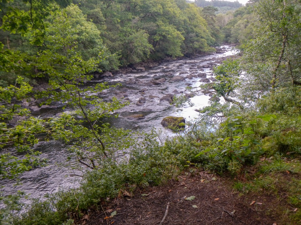 It was raining so much that I didn’t even go down to the Falls of Leny. The path was deserted apart from one man coming the opposite way who commented that the weather was keeping the midges away. I passed the remains of Boscastle Fort: one of the Roman forts located near the Highland Boundary Fault and controlling exit from the Highland Glens.