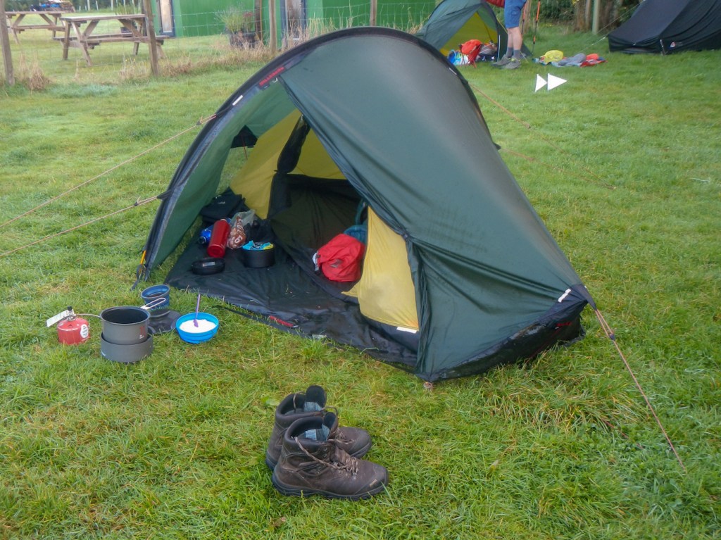 I found a spot eventually but it wasn’t a brilliant place to say the least. It rained in the night and there was a lot of condensation so the flysheet and outside of the tent were soaking by the morning. I evacuated the site and found a place next to the track to lay my tent out to start to dry and to cook breakfast. Lots of cyclists and a single runner were up and about so early on a Sunday morning and passed me. Eventually I set off at 09.00am.