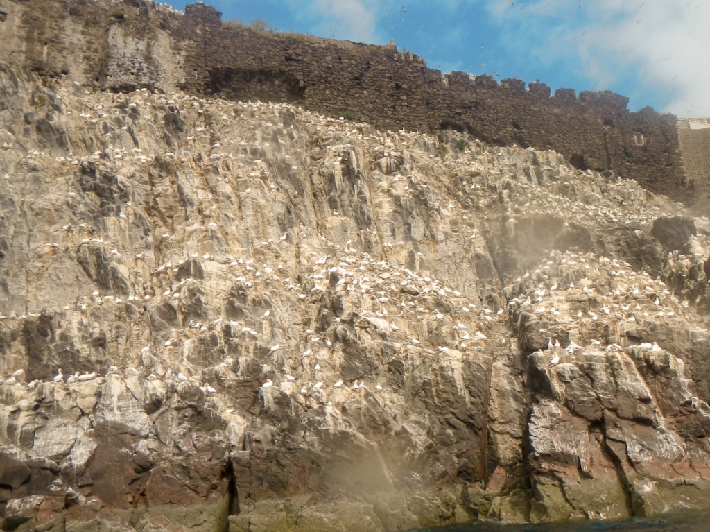I had thought that the colonies in Hermaness were the biggest in the World but in fact the biggest colony of Northern gannets is at Bass Rock. They filled absolutely every single space and each bird has its own position on the rock. We saw the very downy fledglings and the young birds with black feathers. Adult gannets will fight to the death for their position on the rock so the black feathers of the young gannets are a safety feature meaning that adults will not fight them for position.