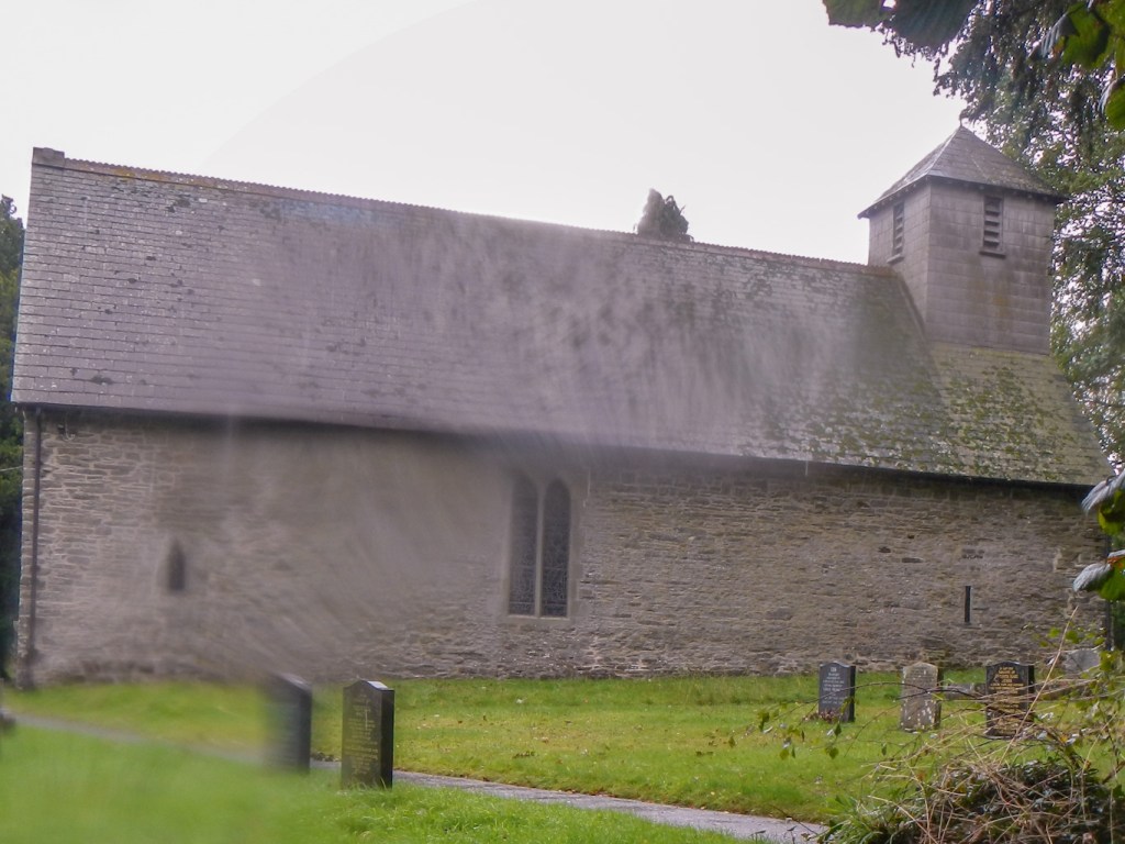 Eventually I was on a country lane again and followed a sign to Huntington Church (a no through road for vehicles). The road seemed to pass through the middle of a farm, but the gates were open. The road was flooded in places too. To my surprise, the church was unlocked so I sheltered for a few minutes to rest my legs out of the rain. The north wall is the oldest part of the church, dating from the thirteenth century. The square bell tower was added in the seventeenth century.