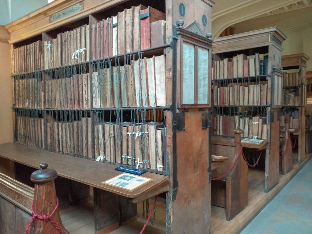 The chaining of books was a security system used in European libraries from the Middle Ages to the 18th century. A chain is attached at one end to the front cover of each book; the other end is slotted on to a rod running along the bottom of each shelf. The system allows a book to be taken from the shelf and read at the desk, but not to be removed from the bookcase. The books are shelved with their page edges, rather than their spines, facing the reader; this allows the book to be lifted down and opened without needing to be turned around as this would lead to the chain becoming tangled.