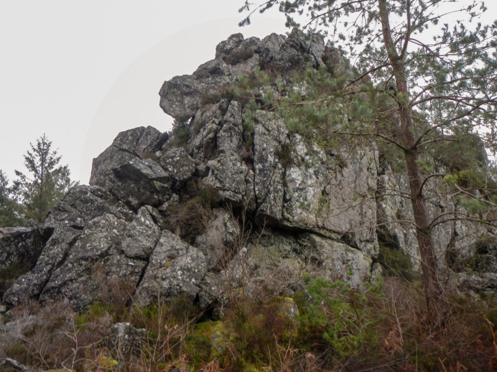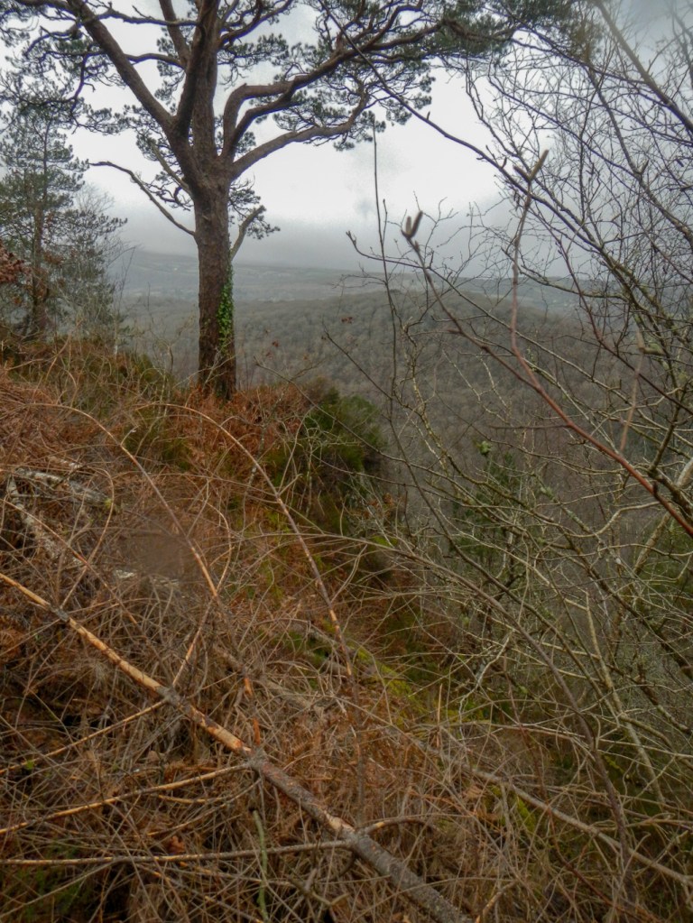 I managed to navigate on to the track passing just above the top of Raven Rock, a place where the views would have been amazing if the weather had been better. I descended along the track and noticed a lower track doubling back which I followed in the hope of seeing Raven Rock from below. Unfortunately there was some forestry or path work with a large works machine blocking the way so I wasn’t able to walk back far enough. However I did have the impression of towering rocks in between the trees ahead of me.