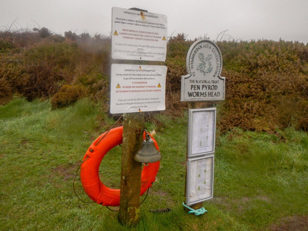 Before long, I had reached grassy ground – the Inner Head. The name Worm’s Head is derived from an Old English word ‘wyrm’ for ‘sea serpent’, describing the appearance of the geological feature. The headland of carboniferous limestone comprises three islands and my aim was to reach the Outer Head (third island). As I stepped “ashore”, I couldn’t miss seeing another notice detailing the tide times, as well as a bell to use if stuck on island at the incoming tide. I had already decided that I would turn round after two hours; that would mean getting back to the Lookout Station by 5pm if the return walk and scramble took the same time as the outward. I would also have a spare hour before the causeway was predicted to be impassable around 6pm, although, of course, darkness would be descending (I had a head torch in my rucksack).