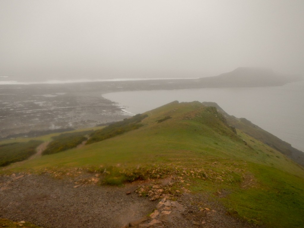 As an aperitif I enjoyed a walk in mist and intermittent drizzle over soggy terrain down to the beach, then along a path below the cliffs to the Hillend campsite. I climbed up the steep hill to a burnt mound and then proceeded further uphill along the ridge of Rhossili Down. There would have been magnificent views both over the huge expanse of the bay and inland over the peninsula. However the penetrating mizzle continued accompanied by wind. Soon I reached a trig point. Standing at 193m, this is the highest point on the Gower and is the site of a Bronze Age cairn.