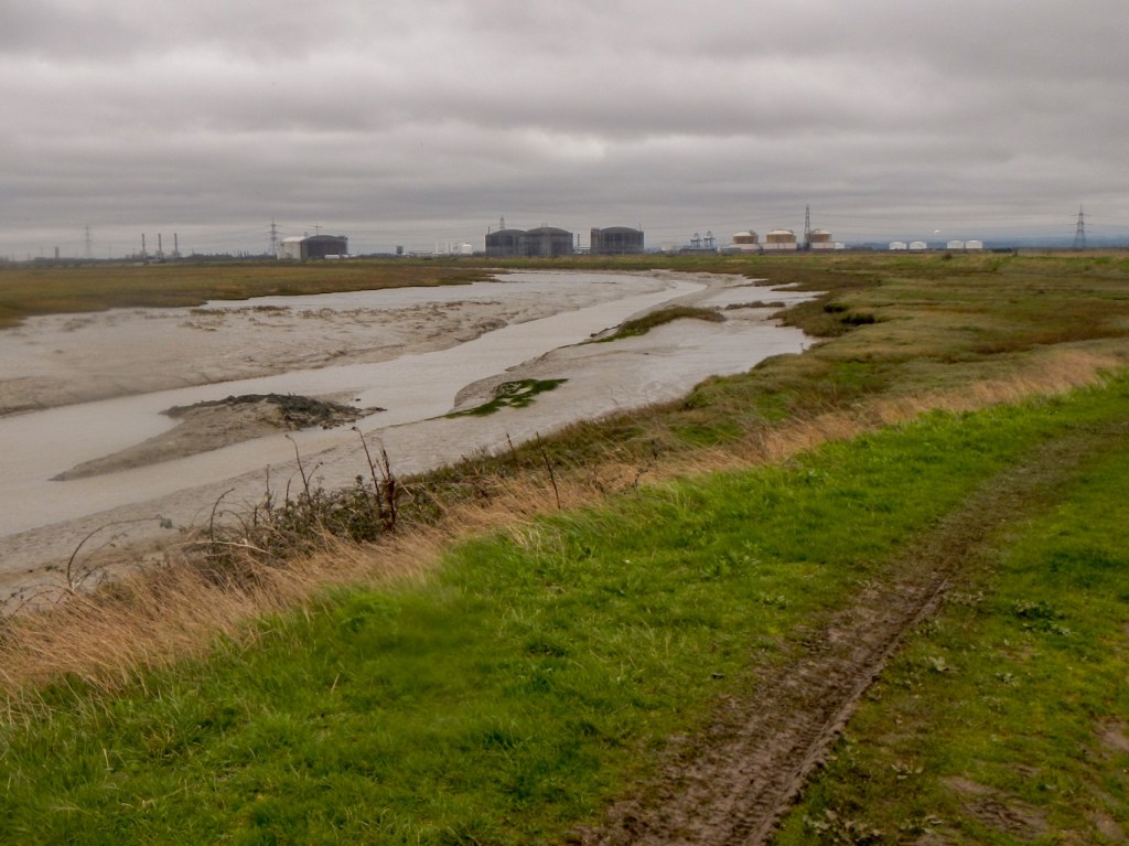 After passing Allhallows, I was soon walking along the bank of Yantlet Creek and then the path crossed over on to the Isle of Grain, which is no longer an island. It is almost all marshland and is a major habitat for diverse wetland birds. However there is a disused oil refinery, a power station and a liquefied natural gas import facility as well as the UK’s third largest container port.