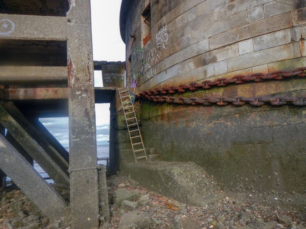 I took some photos from different viewpoints on the ground. I saw a massive chain wrapped round the base of the tower. This dates from the First World War, when the Grain Tower found an additional purpose as one end of a boom defence stretching across the Medway to Sheerness. Even from the ground the tower seemed to be a sombre and eerie place. I soon made my way back to the promenade.