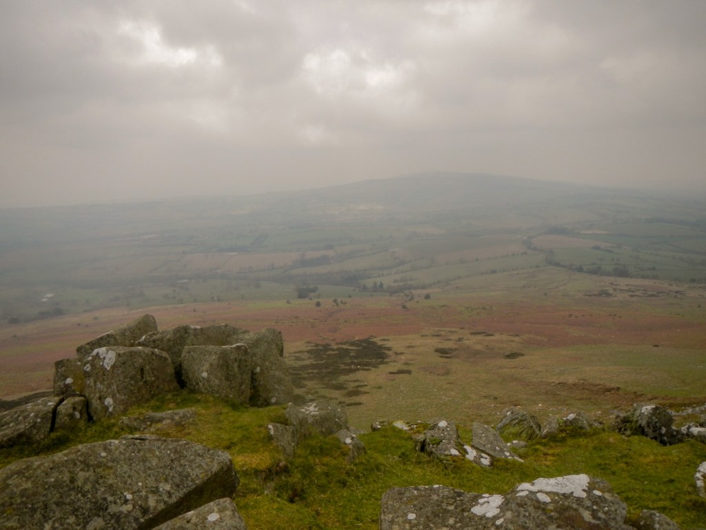The climb to the summit seemed long and steep. The view when I arrived was better than that from Brown Clee as, for a brief period, the sun came up. I spotted some remnants of snow – and later discovered that, less than a week before my visit, the entire hill had been snow covered. The summit boasts a trig point, a radar station, old quarries, remnants of another Iron Age hill fort, with walls of stone blocks rather than earth and a pile of boulders named The Giant’s Chair.
