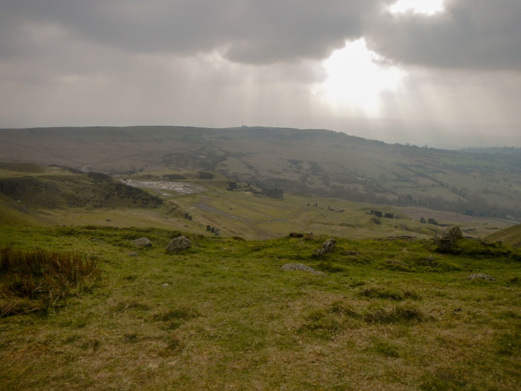 The footpath through the woods was very muddy so I was relieved that I was wearing my gaiters. I reached open ground and the summit of Abdon Burf, at 540m the highest peak of Brown Clee, within forty minutes of leaving my car. It’s the highest hill in Shropshire and a toposcope at the summit points out local landmarks. The hazy conditions meant I couldn’t see much except the radar masts and the derelict quarry and mine buildings. Coal, ironstone and dhustone (a carboniferous dolerite used in construction) have been extracted. Remnants of a large Iron Age fort remain although very damaged by quarrying activity.