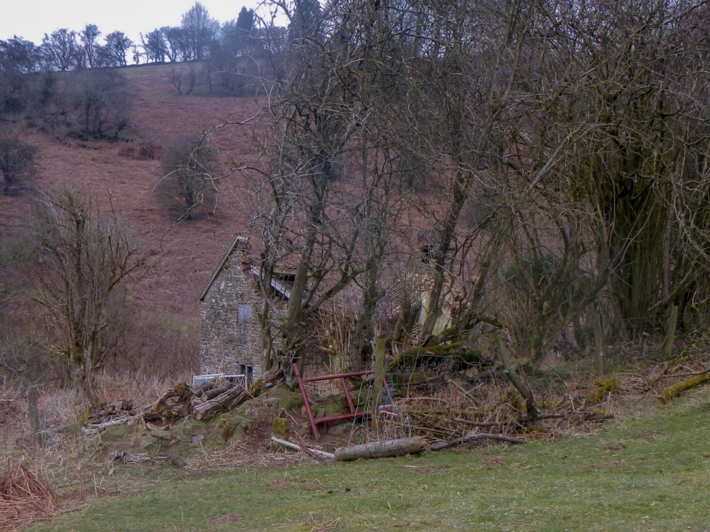 I descended to the isolated hamlet of Cockshutford, where I spotted a phone box repurposed to house a community defibrillator. I followed a track up a valley past some houses and a derelict isolated cottage.