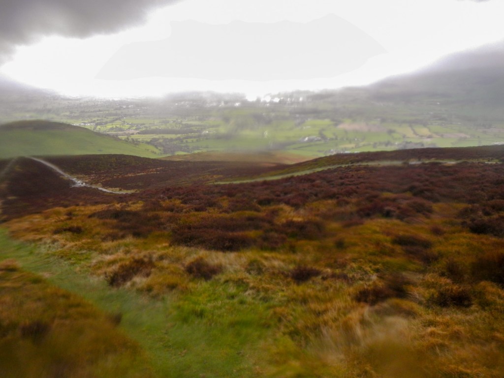 No sooner than I was at the summit, but I was descending to another road south of Moel Arthur and another roadside car park. Having descended, the route immediately climbed again. A runner was coming down the path carefully, saying it was too wet and slippery to run. There was also a large group of walkers. It was getting more and more windy and at times it was a struggle to walk in a straight line.