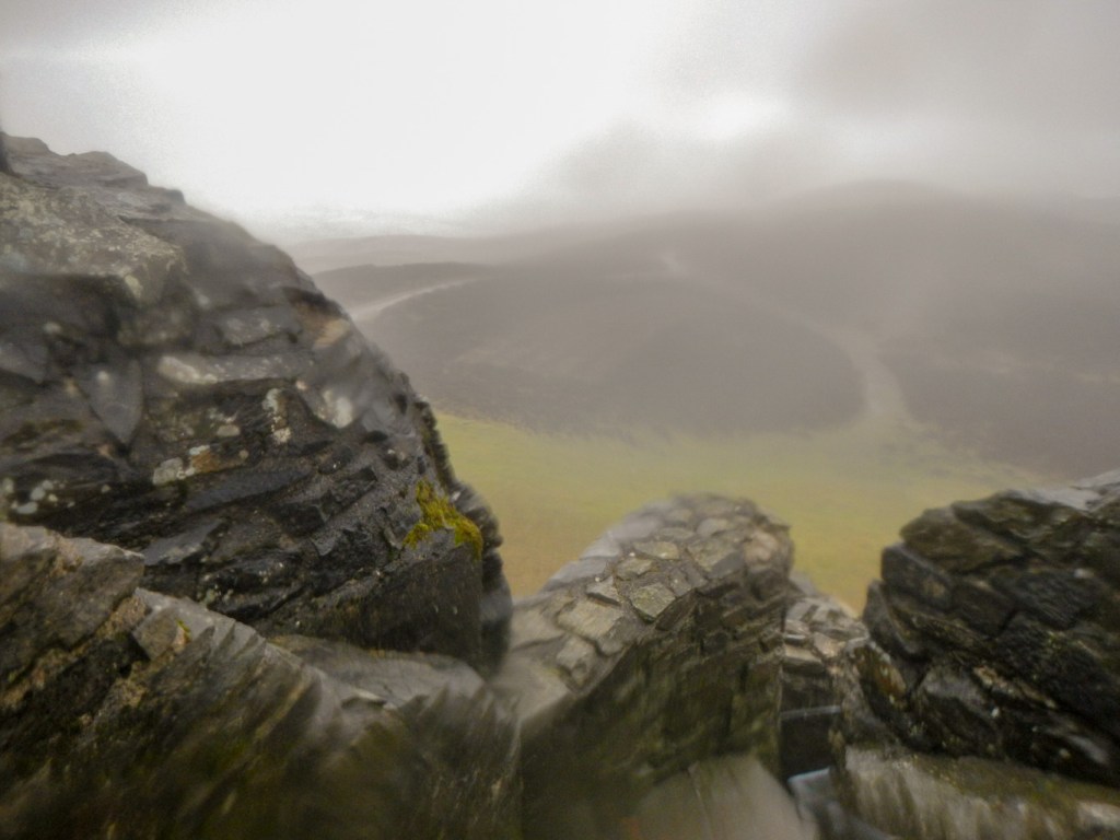 I was almost at the summit of Moel Dywyll (475m and two cairns), when I saw two people looking rather incongruous, carrying their coats. It was really windy and had started raining, with the rain coming almost horizontally carried by the wind.