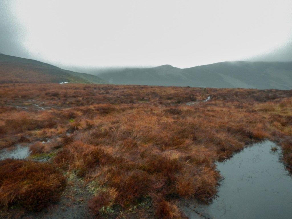 I pulled on my boots and gaiters and set off up the mountain path. The visibility was poor and of course worsened as I climbed higher and was walking above the cloud base. There’s steep drops over cliffs but it wasn’t too foggy for me to see that and I was following a fence line so unlikely to stray. The ground was extremely wet and boggy.