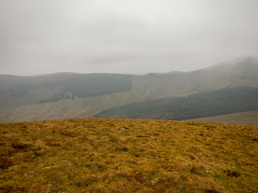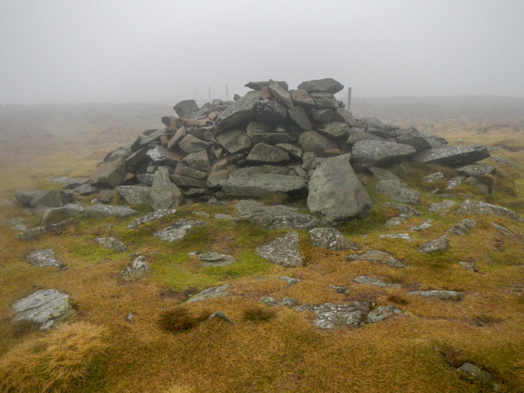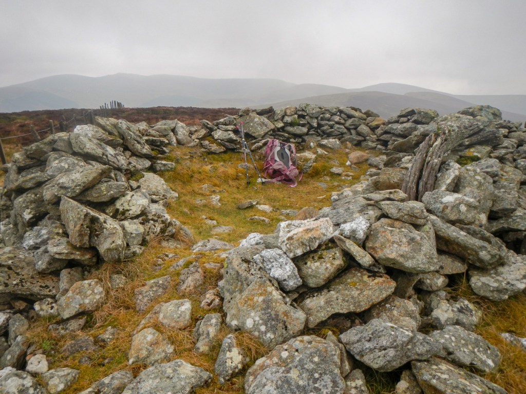 As I ate lunch, the weather worsened again. I didn’t stay for long and so I began descending on a boggy indistinct path before ascending to a small peak, Rhos, marked by a boundary stone. I climbed again to a tumulus, which also afforded a good view.