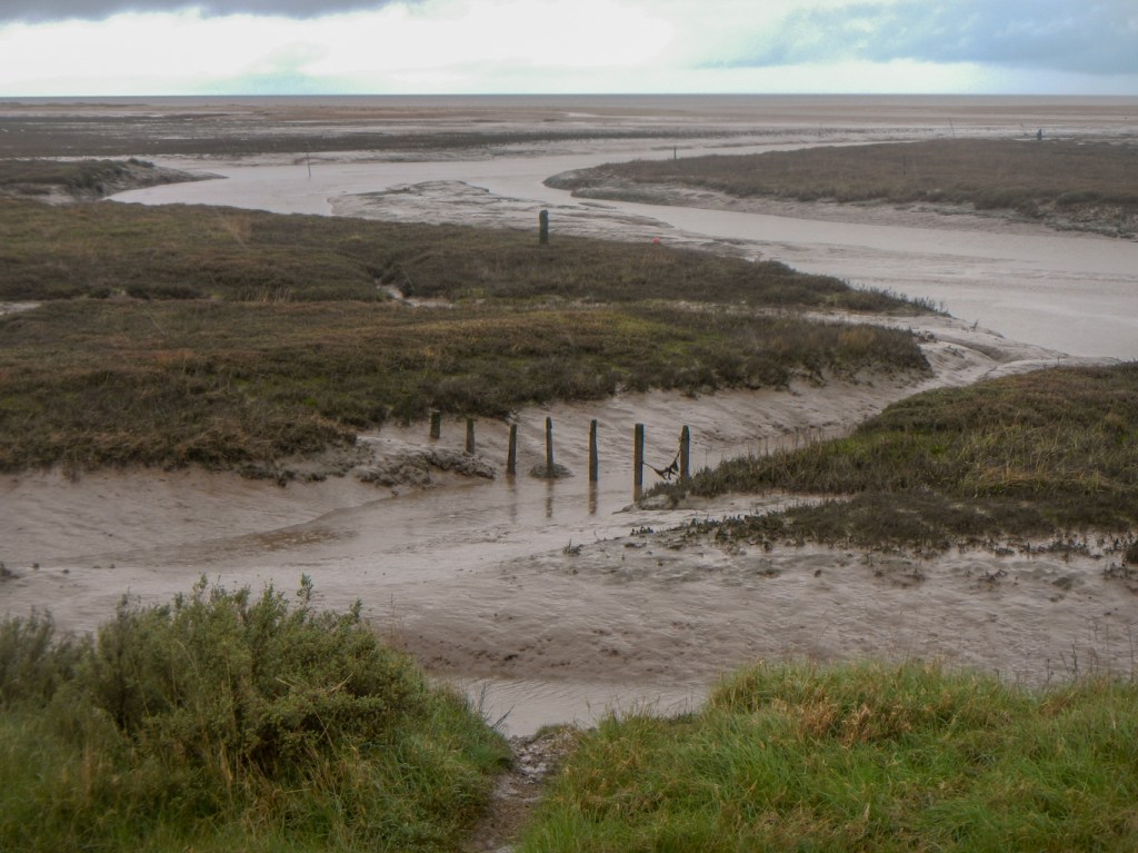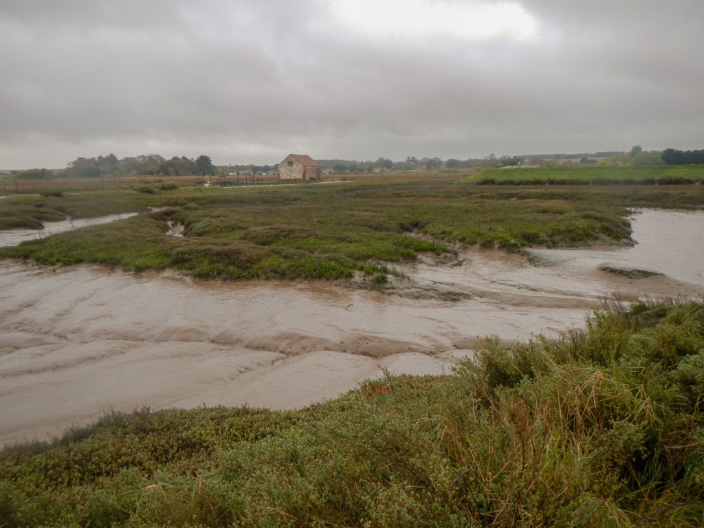 However I had plans for some subsidiary adventures too. I had spotted a public right of way marked on the Ordnance Survey map from Burnham Deepdale to Scolt Head Island and was keen to try to walk there. I’d looked at some information on a blog site and noted that people had managed the expedition across the mud flats at low tide, although the trip did appear tricky. Most people going to Scolt Head Island travel on the ferry which runs two hours each side of high tide but only during the summer. Low tide was just after 1pm; we arrived at the start of the footpath around 11.30am so that if it proved possible I could attempt the crossing both ways on the ebbing tide. Almost immediately, the route was over mudflats. Sadly for my plans there was no safe route even over the first creek and I could see on the map that this was small compared to a crossing further on along the route. I got very muddy searching for a possible crossing point.