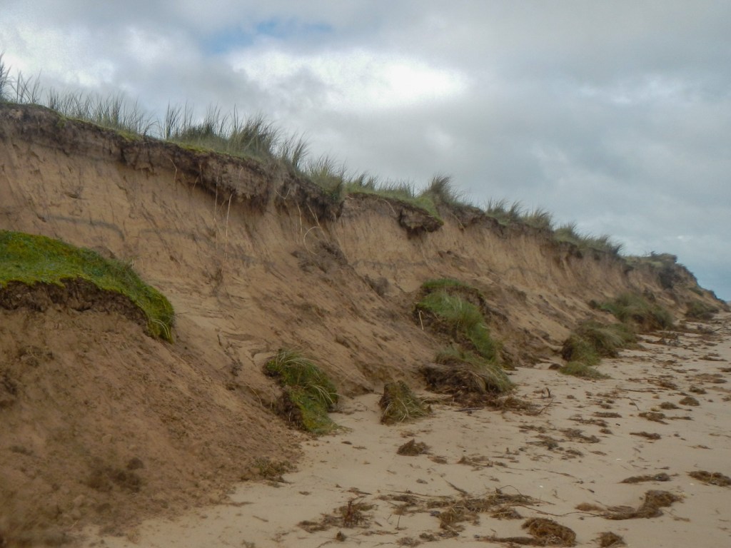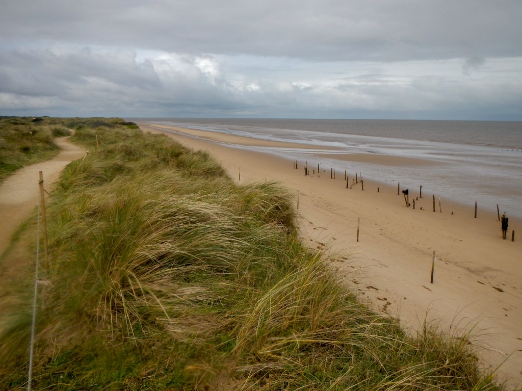 I passed an information board close to the point where one of the two local Bronze Age structures constructed from oak wood in 2049BC was excavated in the late 1990s. It was named “Seahenge” by the press although it wasn’t at the sea when it was built and isn’t a henge. It was originally built on salt marsh which nowadays, following coastal erosion, is part of the beach. Its purpose is unknown although various ideas have been proposed.