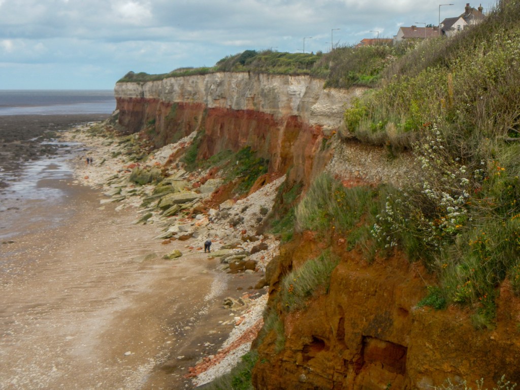 I spotted my husband, sheltering from the wind in one of the ornate Victorian shelters. We walked together to look at the famous and eye catching red and white striped cliffs. Even in these windy conditions, there were fossil hunters on the beach – coccoliths – microscopic plants; bivalves – similar to cockles and oysters; belemnites -similar to cuttlefish; ammonites – similar to nautilus; brachiopods – similar to clams; echinoids – sea urchins; and shark’s teeth fossils have all been found here. The stripes in the cliffs are caused by layers of different-coloured rock. Carrstone is the brown layer and consists of sandstone – sand cemented together by iron oxide. In places where the cement is stronger, the rock is darker and less crumbly. The red chalk layer is also due to staining by oxidised iron and there is also a non stained white chalk layer.