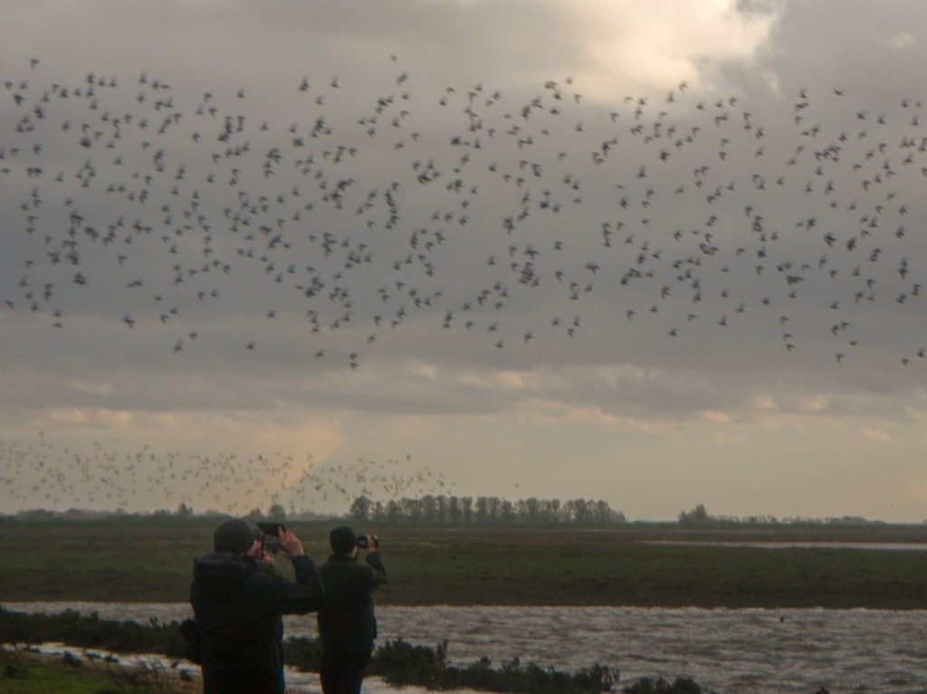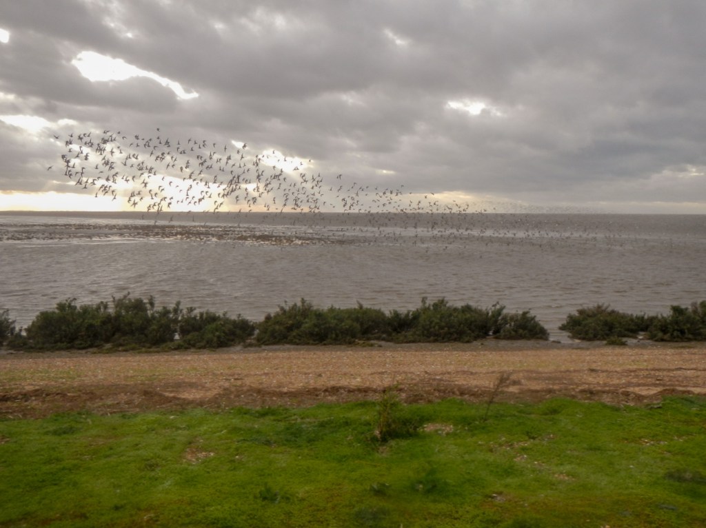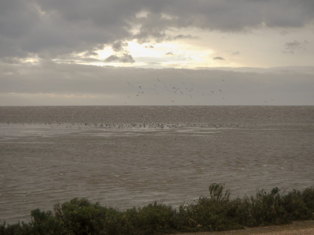 When I arrived back at the viewing point, a few birds were flying inland in small groups. However after a few minutes, I was rewarded for my perseverance and patience when I spotted a huge flock of birds in the distance. The flock seemed to move as a unit and the “bird cloud” formed undulating curves across the sky; there were also curves and swirls as the flock changed direction before re-landing, presumably on mud that was still not underwater. I could see water pouring over the rivulets within the mud flats and forming areas of waterfalls and rapids depending on the local contouring of the mud. The spectacle continued for some time with huge flocks appearing to form curves of black in the sky. When the birds were near, it was possible to see individual dots moving in the massed flocks.