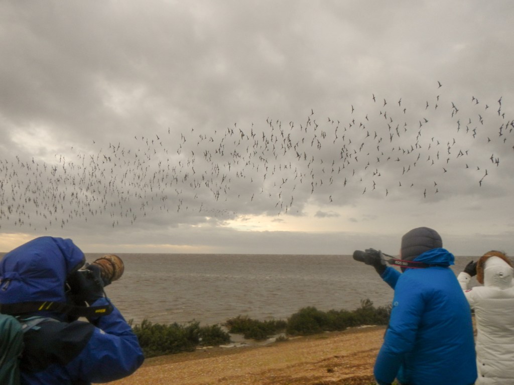 Eventually, most of the birds had gathered on the few remaining promontories of exposed mud. Soon the grand finale took place as, in four or five huge flocks, the birds flew almost overhead to the lakes behind.