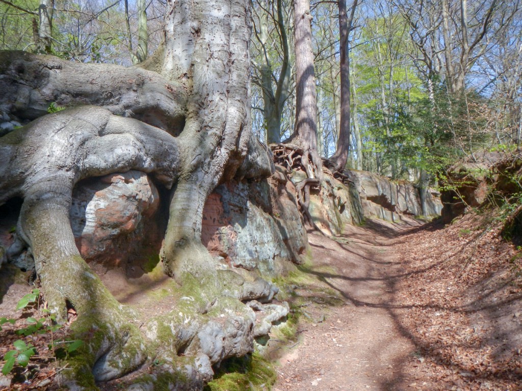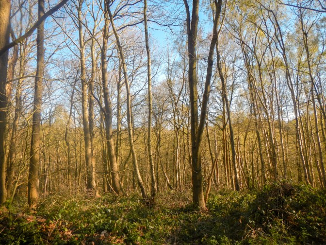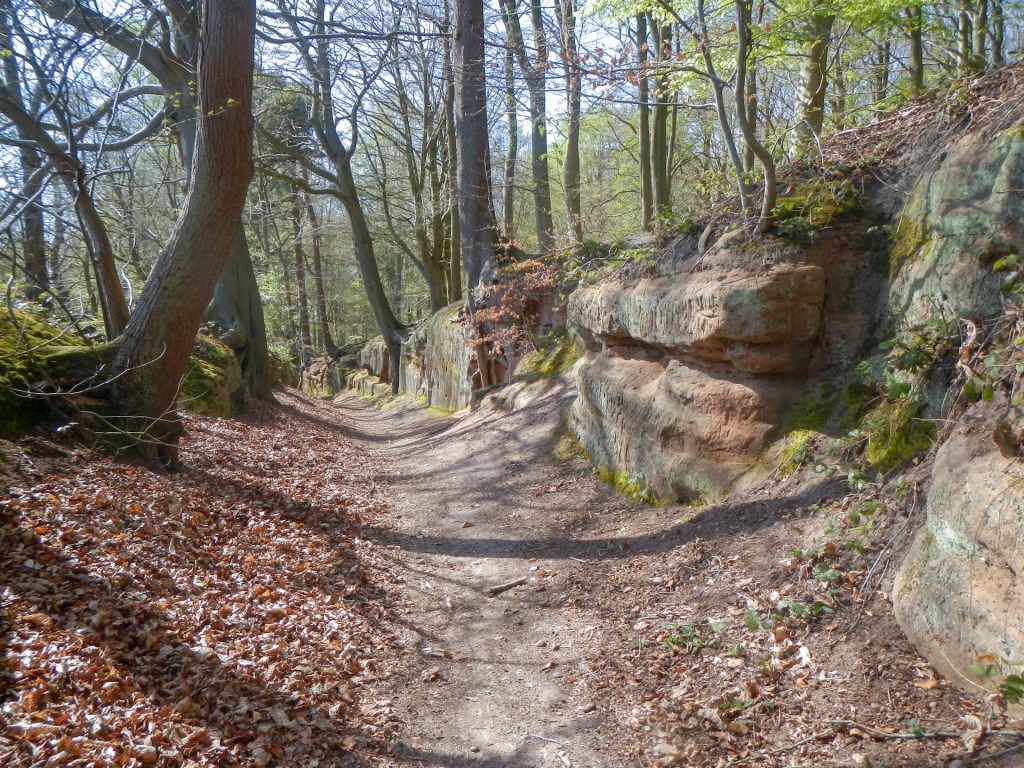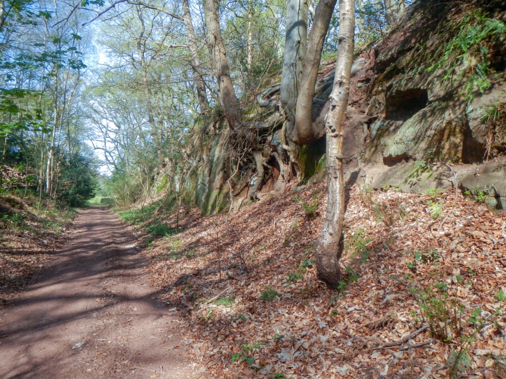 The route follows a well defined track, probably a further part of the ancient Nottingham to Mansfield road. It passes close to Newstead Abbey and the ruins of the priory although not into the grounds (quite) so I didn’t have to pay the admission charge. The track was beautiful especially as daffodils were in flower and the trees just coming into leaf. Robin Hood’s Hills and another Robin Hood’s Cave are a couple of kilometres to the west of where I walked and apparently have fine views of the area where I was walking – however they are on private ground. Robin Hood was said to be able to sit on a flat rock at the east end of the hills and see people travelling on the route where I was walking.