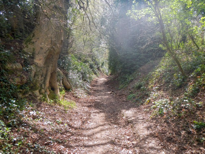 I was dropped off at the same point the next morning to continue my walk. This started with bridleways and footpaths through woods and farmland including past fields of pigs and fields of free range hens. I was very annoyed about the black dog that jumped up on to me, particularly as I was wearing clean clothes before it happened; the elderly owner explained that she can’t keep up with her dog anymore, but the dog was clearly not in her control.