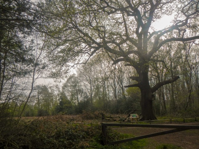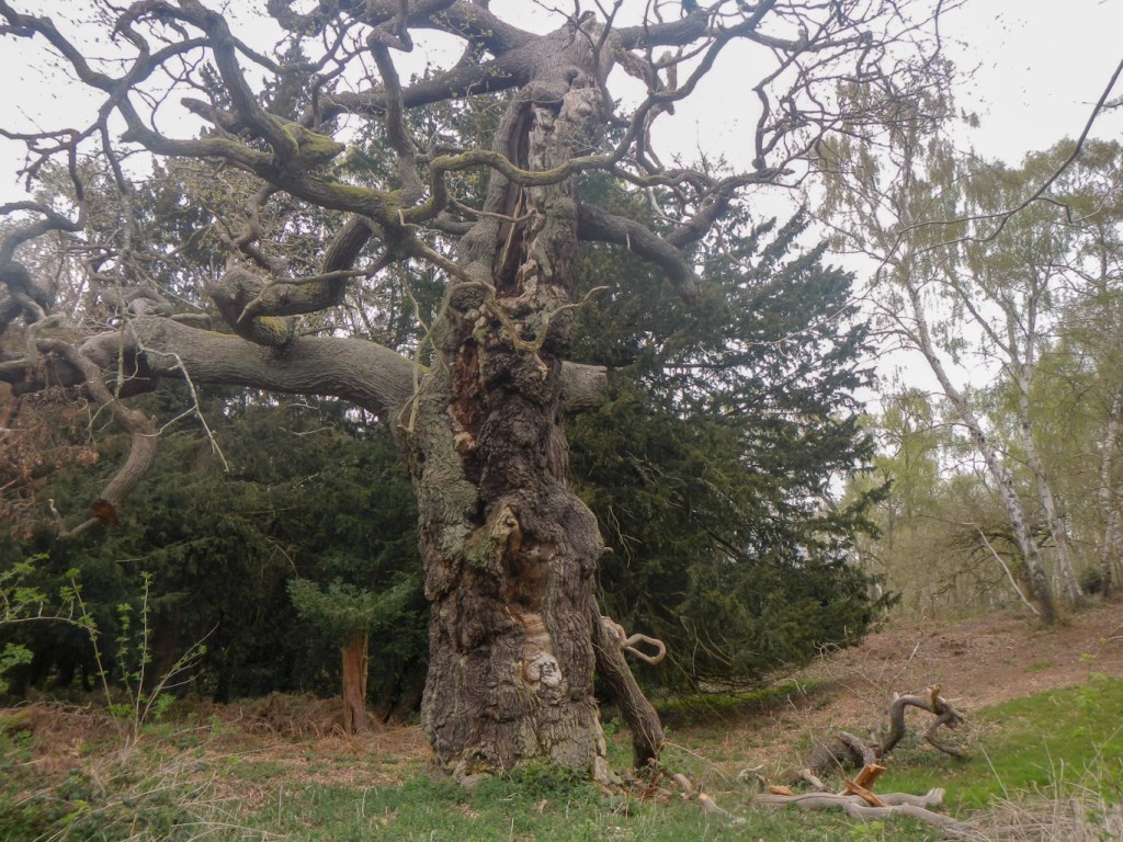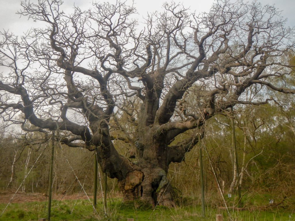 I walked east along the path and reached the impressive major oak. This ancient tree is thought to be the largest oak tree in England and about 1100 years old. The hollow tree has a circumference of ten metres and the canopy spreads twenty eight metres in diameter. The cavity in the trunk is two metres in diameter. It’s been fenced off since 1975 to prevent further compaction of the soil round it by many thousands of visitors’ feet – resulting in water being unable to penetrate to the roots.