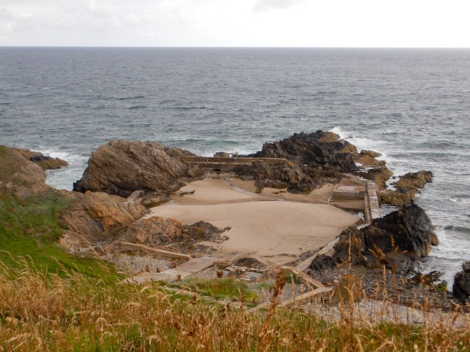 We reached the street and followed it round the coast past old fishermen’s cottages. A path turned off up the hill side and we were on the cliff tops again looking on to the grey and red rooftops below us and seeing washing on the lines billowing in the breeze. Many of the boats tied up in the small harbour were left high and dry as the tide was low.