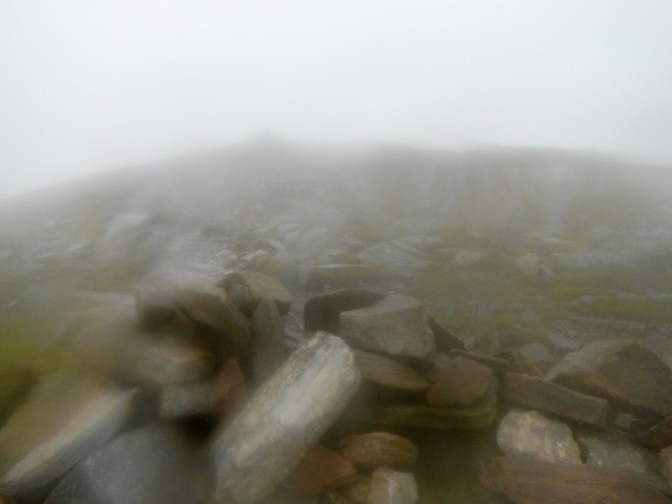 I arrived at a flatter area where another woman descending told me that there was no view from the summit today. She couldn’t remember when she had last enjoyed a mountain top view so I explained that I had two the previous day from Morven and from Maiden Pap! She warned me of some crosswinds between An Cabar (946m subsidiary summit ) and Glas Leathard Mor (1046m high point of Ben Wyvis); she was pleased to be descending.