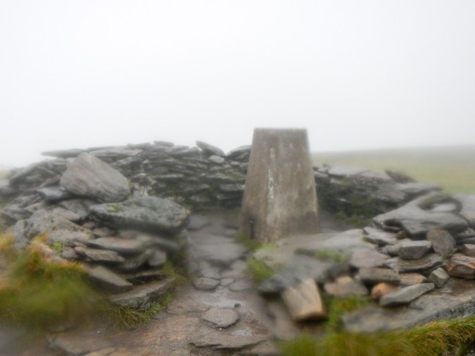 As I set off towards the summit, I saw another walker approaching An Cabar, but didn’t see him again so I suspect he turned round there. The path over this somewhat flatter terrain of the summit plateau was less distinct. There had been instructions to keep on the centre of the path to reduce erosion as it’s a Nature Reserve. This was difficult as it was unclear at times where the path actually was. It only took me about thirty minutes to reach the very exposed and windy summit trig point. There was no view – on a clear day there are extensive views.