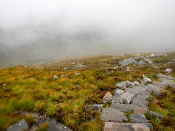Eventually the path deviated away from the stream. The visibility worsened as I ascended a stepped section but the path was clear and wide so I certainly didn’t feel at risk of exposure to big drops.