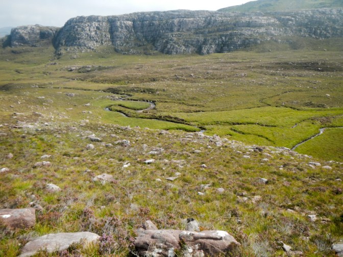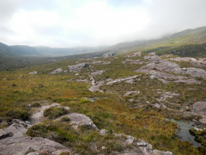 The path became indistinct – actually there’s no path marked on the map. I tried to stick to the sandstone slabs as much as possible as they provided an easier surface for walking. In places there were cairns which were possibly marking the route, although I was on a different line to the GPX route on the Walkhighland website.