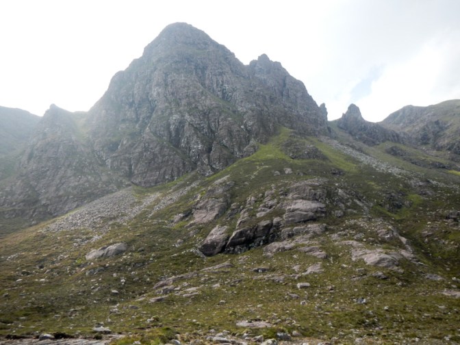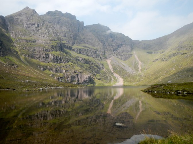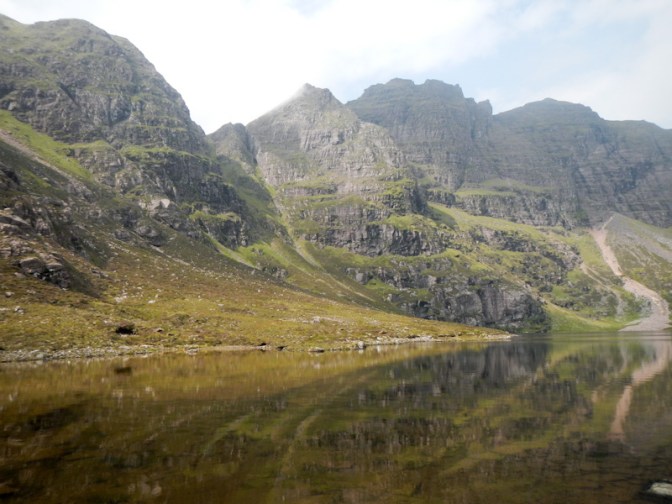 This was the spot for me to sit and enjoy my lunch whilst taking in the views. The sun shone on the great headwall. This has been nicknamed “The British Eigerwand”. I could see Sgurr Fiona, Lord Berkeley’s Seat and Corrag Bhuidhe and the peaks were reflected in the water of the lochan below.