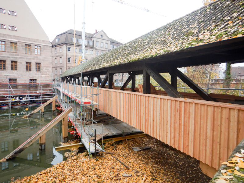 We’ve been to Brussels previously so just had one night in a hotel close to the station before starting our second train day, loading a journey to Frankfurt on to our passes. The landscape is very flat. We crossed the River Main. Once at Frankfurt, and certain of our connection, we loaded our journey to Nuremburg. The scenery became more undulating but still predominantly rural. This was our destination for a two night stay. The train was delayed – as we were to discover, delayed trains are par for the course in Germany. However, our hotel was near the station and close to the old town so there was time to wander round before dark. Christmas market preparations were in full swing and the Christkindlesmarkt is one of the oldest and most iconic Christmas markets in Europe.
