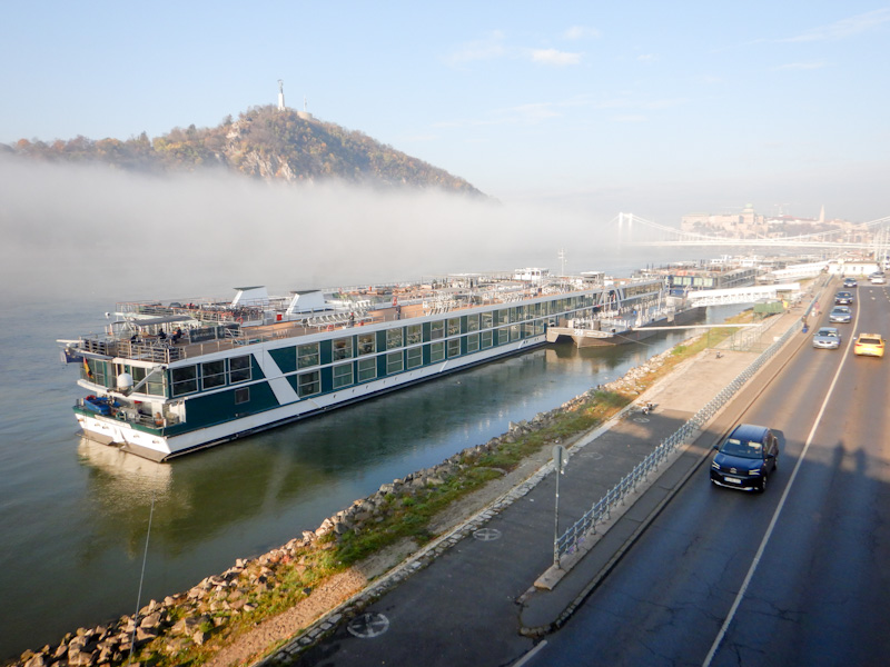 We walked on increasingly crowded streets to the Danube. The early morning mist was beginning to lift as we reached the Central Market Hall so we diverted to view the huge green iron Liberty Bridge across the Danube. Initially built as part of the Millennium World Exhibition at the end of the 19th century, the bridge features Art Nouveau design, mythological sculptures and the country’s coat of arms adorned on its side. it-s actually the shortest bridge across the Danube in central Budapest, linking Pest where we were standing to Buda where we were to visit later.