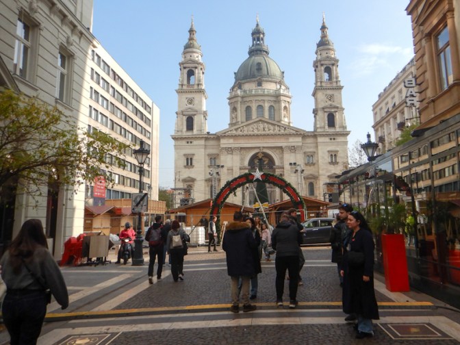 We were ready for lunch enjoyed at a restaurant in the Little Square near the Town Hall Tower. There was an area of covered semi-outdoor seating warmed by a heater so we were able to watch the crowds in the square as we ate a traditional Hungarian meal of beef goulash with polenta.