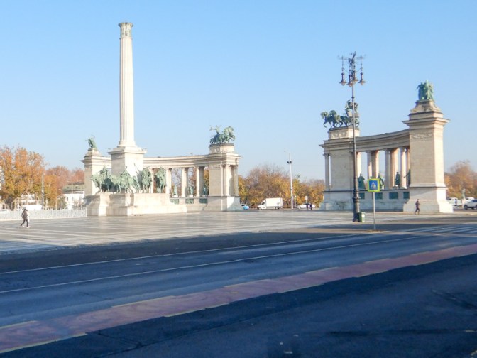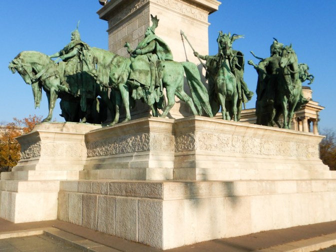 The street ends at the enormous expanse of Heroes Square, flanked by the Museum of Fine Arts and the Hall of Arts. The iconic Angel Gabriel statue on the large column has been removed for restoration. At the base of the column is a group of seven mounted figures representing the Magyar chieftains who led the Hungarian people into the Carpathian basin.