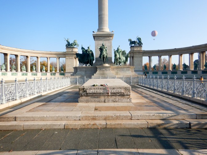 At the front of the monument is the Memorial Stone of Heroes (Hősök emlékköve), a large stone cenotaph surrounded by ornamental iron railings, providing a tribute to those who died defendinding the borders of Hungary. There aren’t any human remains interred but just an artesian well which provides water for the Széchenyi and Dagály thermal baths.