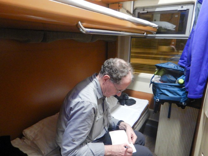 We rushed across, with the advantage of travelling light and somehow managed to find what were possibly the only remaining unreserved first class seats on the train packed now with its own load and the transferred passengers. There was already a couple in the six seater compartment and two women dumped huge cases and a coat on the floor in front of our seats and two empty but reserved seats opposite us. At the next station, an Australian couple who had reserved the two seats opposite boarded with lots of luggage. Fortunately we were all English speaking and so could explain that the other huge cases weren’t ours. We just pushed them out into the corridor as we didn’t know where the owners had gone! Things became even stranger when our tickets were checked and the couple who had already been in the compartment when we boarded were despatched to second class. Now we were just four people in a compartment for six. The ladies with the cases and coat came back looking for their cases which by then had slid down the corridor.