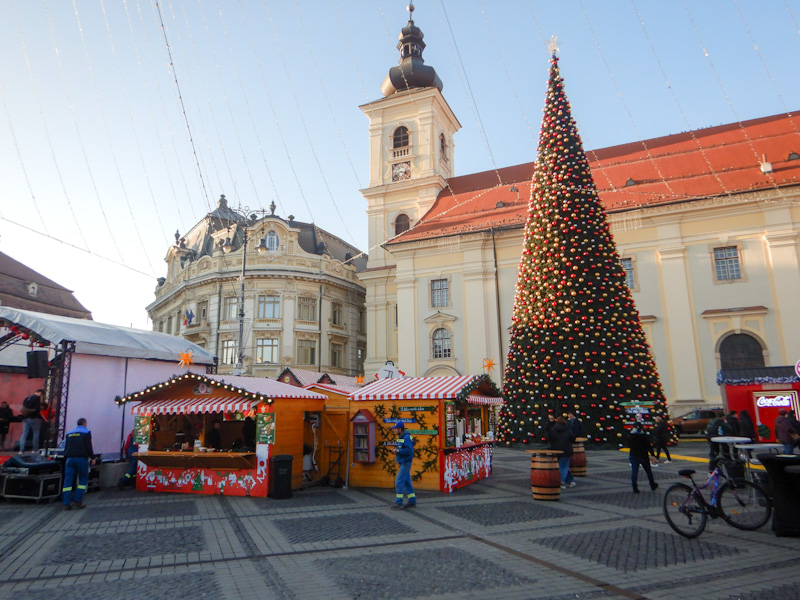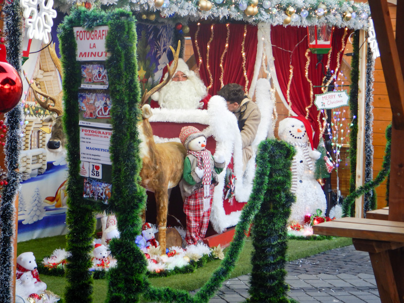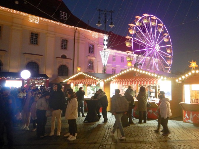 At Sibiu, our booked accommodation was outside the main part of the town. We walked back past the railway station into the town, where the Christmas market was already open (Friday 14 November), possibly for the first night of the season.