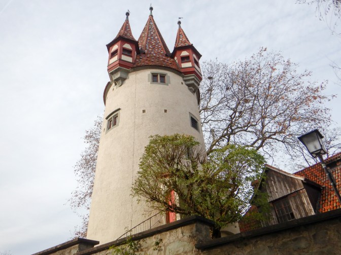 The round tower on Schrannenplatz is topped with a brightly tiled pointed roof and turrets. It’s called the Diebsturm (thieves tower) and dates from around 1400.