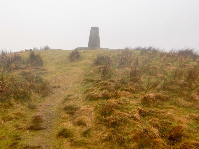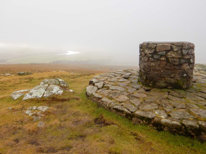 I turned south after passing the forest, heading towards Foel Cwmcerwyn, at 536m the high point of the Preseli Hills. Oddly a group of men were descending carrying a body board – a week earlier this could have been used as a toboggan, but I’m not sure what they were using it for on that day! I passed a prehistoric round cairn and soon the summit trig point was in sight. Unfortunately I was in the cloud once more.