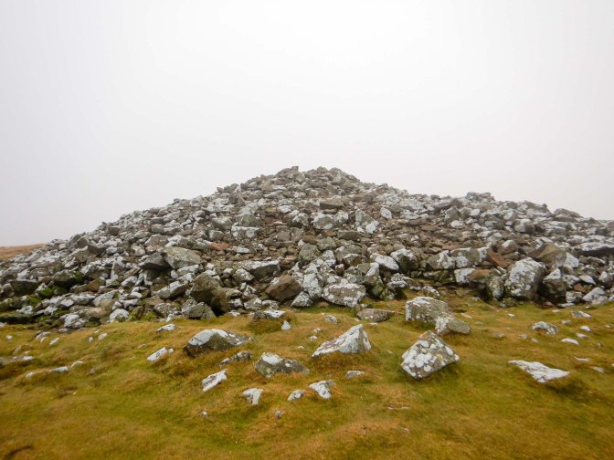It was quite a stiff climb to the cairn at Foel Eyr (468m). The huge pile of grey stones is the remains of a Bronze Age burial cairn. It would have been a magnificent viewpoint but I was in the cloud and I didn’t pause to look at the toposcope to see what I was missing. I was keen to push on to ensure that I would complete the entirety of my planned walk before sunset.