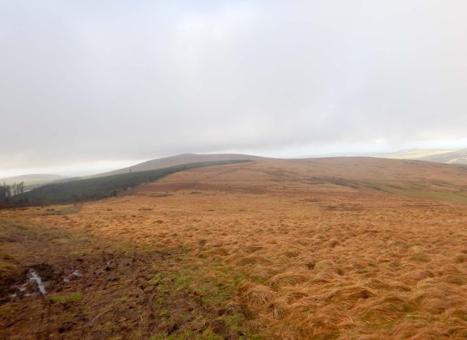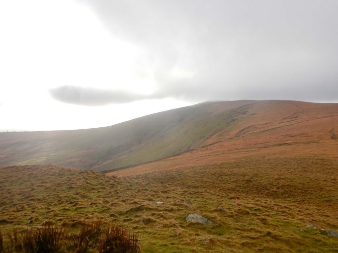 I descended to a car park on the B4329 before starting another climb across open access land, with the Pantmaenog Forest to my right. I passed a couple of walkers heading the opposite way. Looking behind me I could see the summit of Foel Eyr, now out of the cloud.