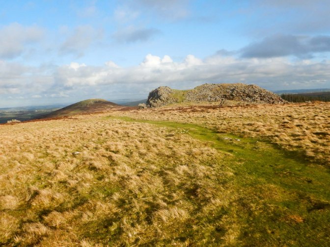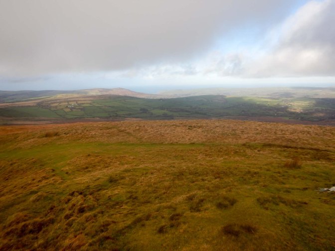 I cut a corner to return to the main ridge. This is “The Golden Road” used as an ancient highway for transporting gold mined on the east coast of Ireland to the south of England. Over its eight mile length there are opportunities for tremendous views over the surrounding countryside. In fact the weather was continuing to improve and I could even see back to Foel Cwmcerwyn which had previously been in cloud.
