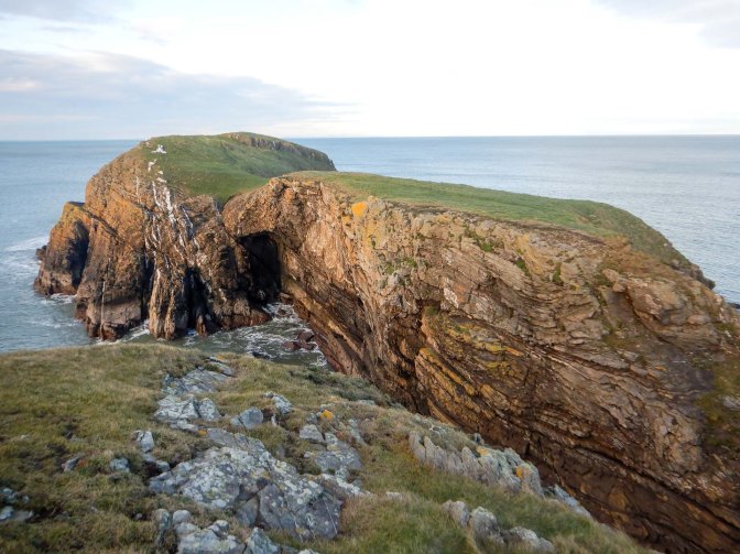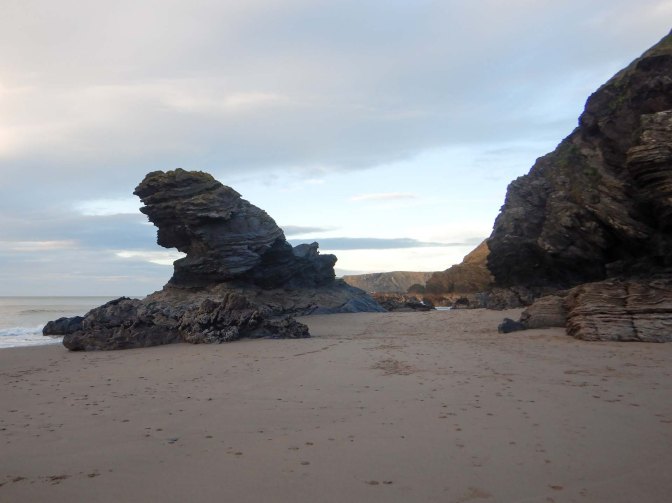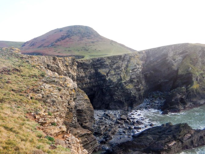 I followed the coast path towards Llangrannog and turned on to a footpath to descend to the beach. The tide was low enough for me to walk on the sand around the small headland and past the stack; legend states that Carreg Bica was a giant’s tooth.