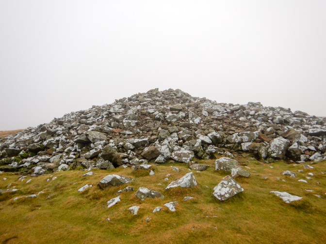 It was quite a stiff climb to the cairn at Foel Eyr (468m). The huge pile of grey stones is the remains of a Bronze Age burial cairn. It would have been a magnificent viewpoint but I was in the cloud and I didn’t pause to look at the toposcope to see what I was missing. I was keen to push on to ensure that I would complete the entirety of my planned walk before sunset.
