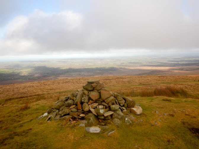 I turned south after passing the forest, heading towards Foel Cwmcerwyn, at 536m the high point of the Preseli Hills. Oddly a group of men were descending carrying a body board – a week earlier this could have been used as a toboggan, but I’m not sure what they were using it for on that day! I passed a prehistoric round cairn and soon the summit trig point was in sight. Unfortunately I was in the cloud once more.