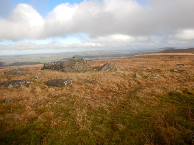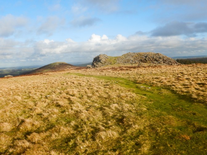 It’s not possible to miss the sight of the prominent Foeldrygarn at the eastern end of the Preseli range. The summit is relatively isolated and hence punches more above its weight than its height of 363m would suggest. The hill is topped by the remains of a hillfort, probably from the Iron Age period. It is enclosed by two dry built stone ramparts and natural outcrops of rock incorporated in the defences. There are three large cairns and a number of hut circles within the enclosures. There’s a trig point on the summit and I enjoyed excellent views along much of the Preseli ridge. A local woman with her two children was making the most of the unseasonably good weather having walked from the road to the summit.