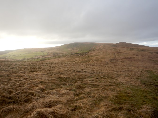 I descended to a car park on the B4329 before starting another climb across open access land, with the Pantmaenog Forest to my right. I passed a couple of walkers heading the opposite way. Looking behind me I could see the summit of Foel Eyr, now out of the cloud.